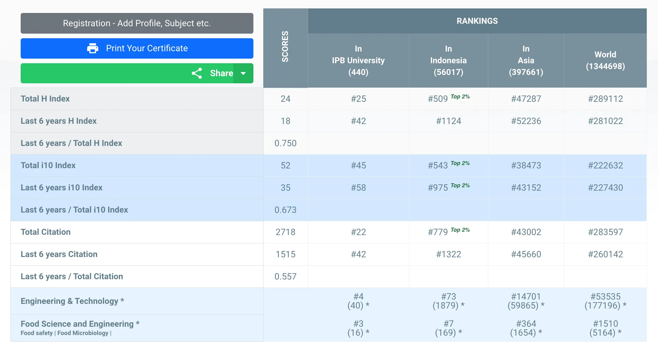 Dengan hasil skor yang tertera di bawah, Winiati P Rahayu menempati peringkat #25 Universitas (IPB University), #509 Indonesia, #47287 Asia, #289112 Dunia secara keseluruhan subjek yang termasuk ke dalam kategori AD Scientific Index 2023.
