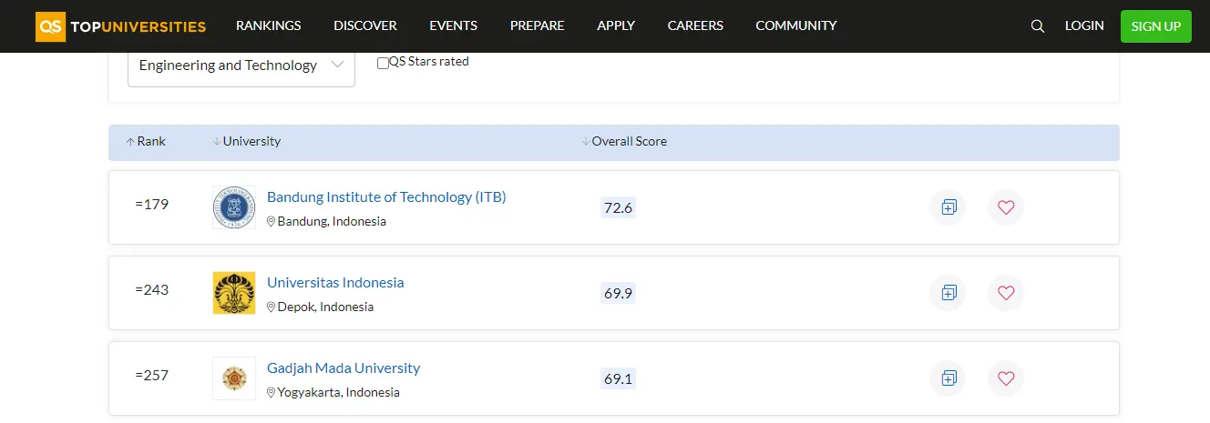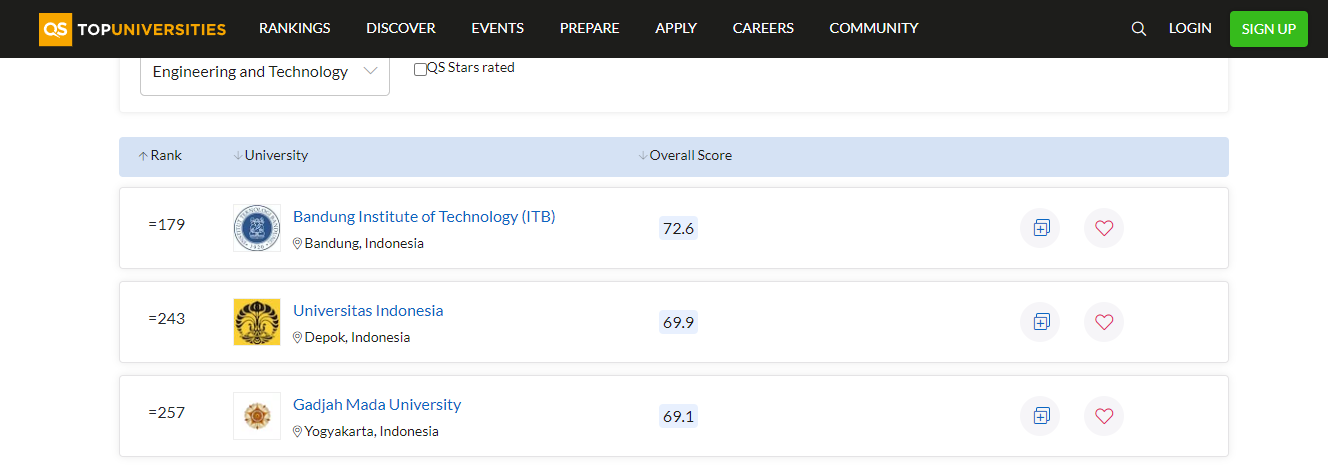 Berdasarkan data dari Quacquarelli Symonds (QS) World University Ranking, yang merupakan publikasi yang menunjukkan peringkat universitas seluruh dunia dengan mengurutkan dari tertinggi hingga terendah dengan beberapa kualifikasi. Kualifikasi yang didata oleh situs ini adalah seperti mendata urutan terbaik berdasarkan subjek atau mata pelajaran yang terbaik, tempat kota pelajar terbaik, dan masih banyak lagi kualifikasi khusus berdasarkan setiap jurusan dan bidang. Data dari situs ini cukup dipercaya oleh hampir seluruh masyarakat karena datanya yang kredibel dan juga merupakan satu-satunya lembaga pemeringkatan universitas berskala internasional. Seluruh orang dapat mengakses situs ini melalui laman https://www.topuniversities.com/university-rankings/university-subject-rankings/2022/engineering-technology. Kalian dapat mencari urutan pemeringkatan sesuai dengan kualifikasi khusus yang tersedia atau yang ingin kalian cari. Tidak terkecuali juga dengan bidang Engineering Technology. Berikut ini adalah data bidang teknik terbaik yang ada di Indonesia menurut data QS World University Ranking berdasarkan urutan 4 teratas