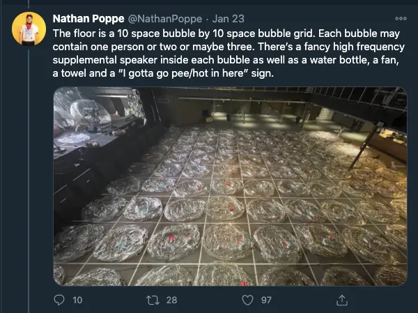 Jika terlalu panas, balon tersebut akan diisi ulang dengan udara dingin menggunakan leaf blower. Penonton yang butuh ke kamar mandi akan dikawal oleh staf yang bertugas setelah mereka mengenakan masker dan melangkah keluar dari balon mereka. Diketahui, penonton hanya boleh melepas masker setelah berada di dalam balon. Pada konser ini, suara penonton di redam sehingga suara tepuk tangan tidak akan terdengar. Sebagai tepuk tangan, penonton dapat meninju bagian atas balon.