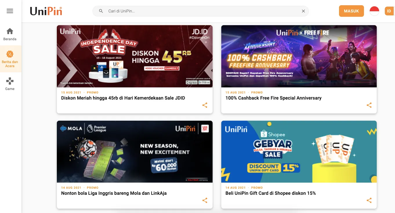 Sebagai penyedia layanan top up game online terdepan, UniPin.com selalu hadir dengan banyak promo-promo terbaru. Kamu bisa cek berbagai promo top up game yang tersedia, langsung di web UniPin.com. Khususnya melalui menu berita dan acara. Di sana kamu akan menemukan banyak promo, baik dari UniPin, dari berbagai payment channel yang ada di UniPin, atau dari gamenya langsung (seperti dari Free Fire, Mobile Legends, PUBG Mobile, dan lainnya).