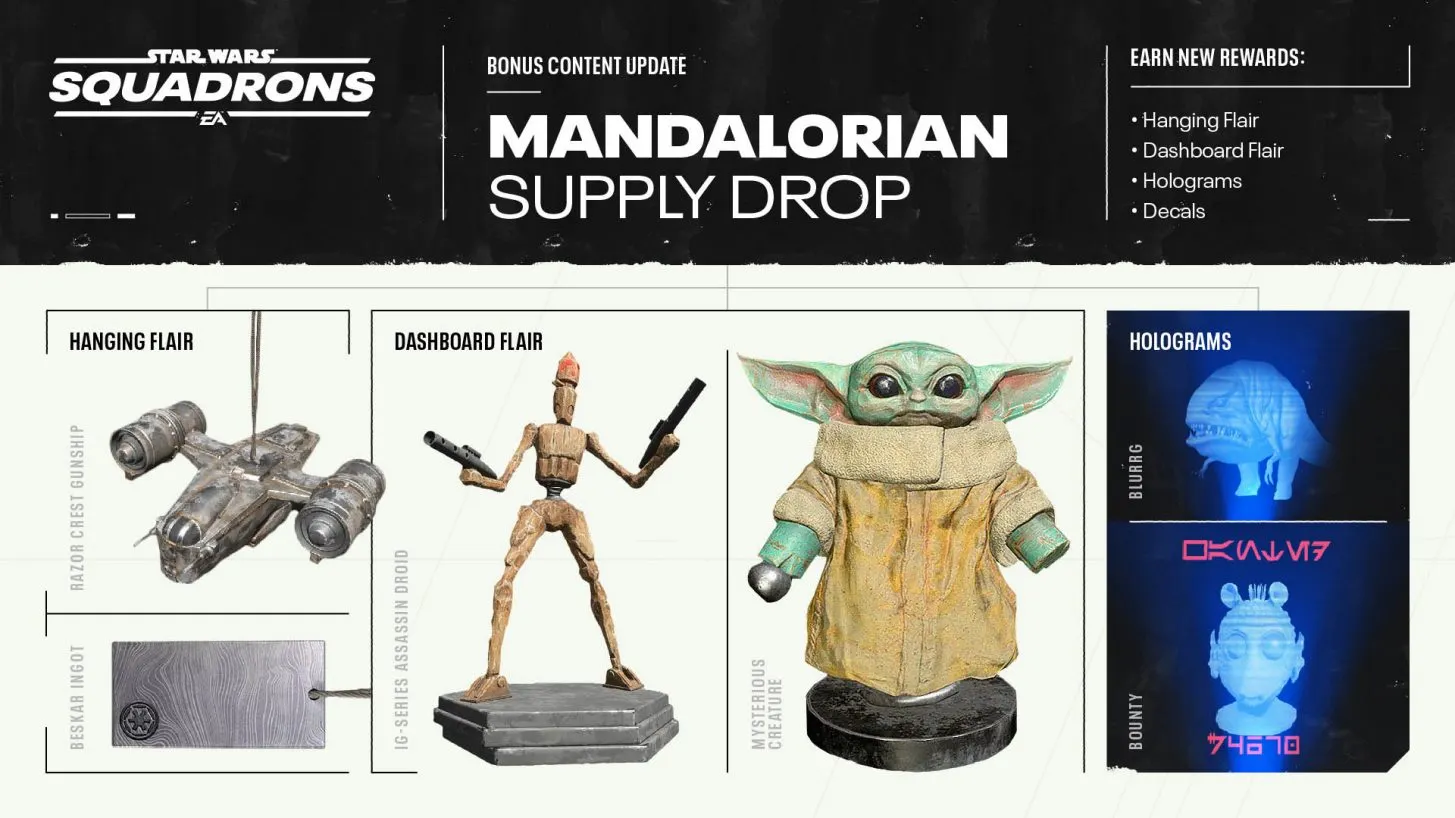 Patung "Mysterious Creature" Baby Yoda bukanlah satu-satunya tambahan yang diterima game simulator penerbangan luar angkasa ini. Masing-masing faksi mendapatkan hologram baru, stiker, patung dasbor, dan beberapa item yang bisa digantung.
