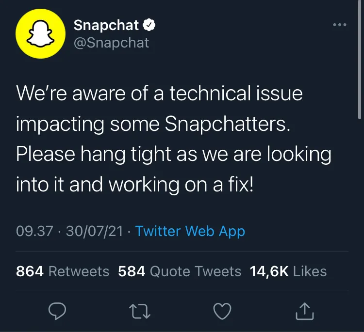 Di tengah peningkatan aktifitas penggunanya, baru-baru ini pengguna snapchat mengalami crash pada saat mengakses aplikasi dengan ciri khas warna kuning tersebut, hal tersebut dicuitkan oleh banyak penggunanya melalui unggahan tweetnya dengan hashtag #SnapchatDown. Hal tersebut ditanggapi melalui akun official @Snapchat yang mengatakan "Kami menyadari adanya isu teknis yang menghambat para pengguna. Kami harap pengguna dapat bersabar dalam masa perbaikannya" pada 09.37 WIB.