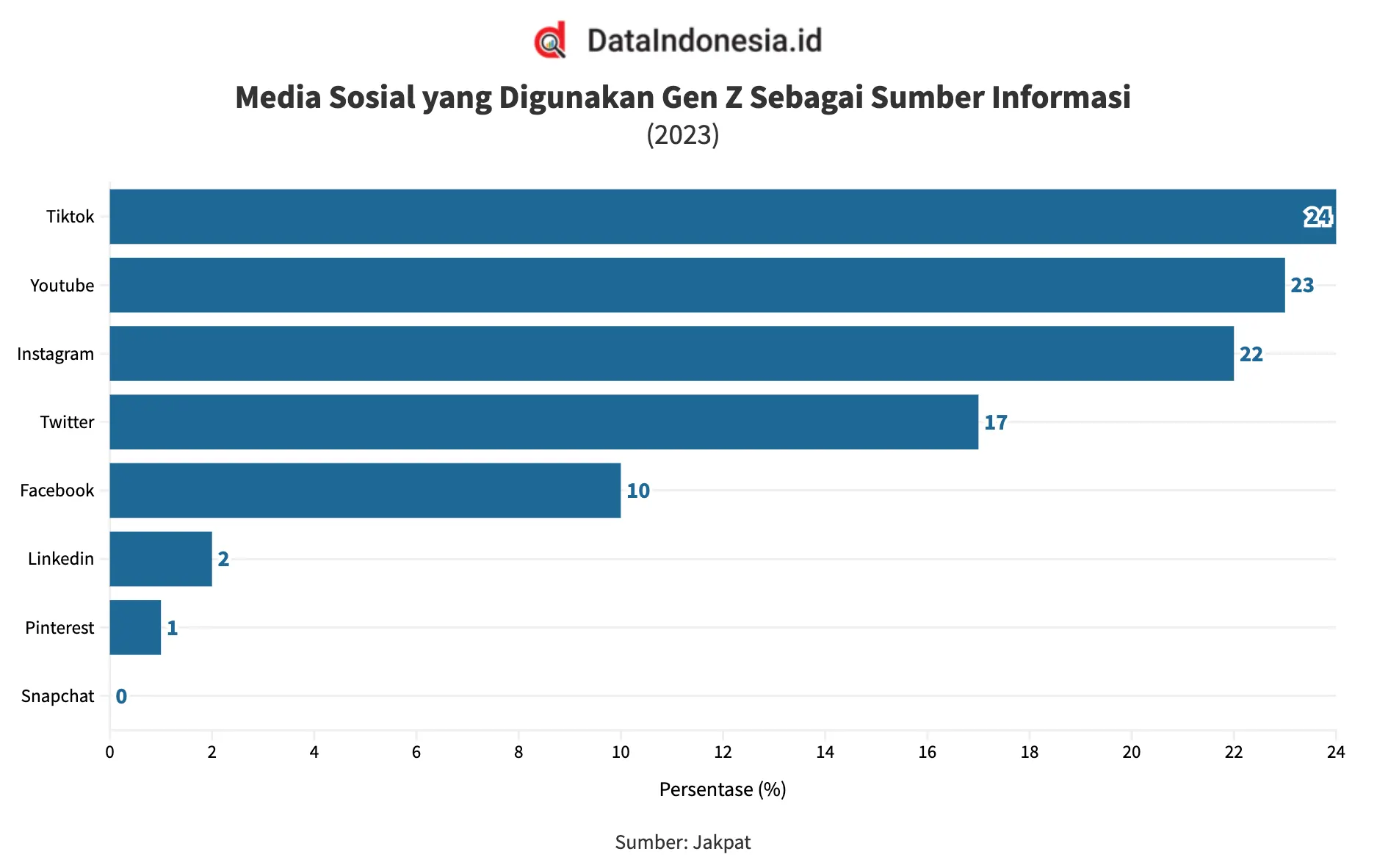 Menurut laporan tersebut, TikTok menempati posisi pertama menjadi sumber informasi yang paling banyak digunakan oleh generasi Z pada tahun 2022, dengan 24 persen responden. Selanjutnya, pada posisi kedua ditempati oleh Youtube dalam mencari informasi, sebesar 23 persen responden. Kemudian, Instagram menempati posisi ketiga sebanyak 22 persen responden untuk mencari informasi.