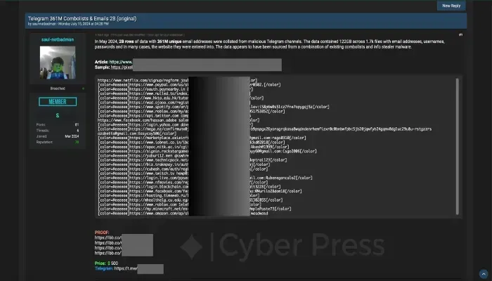 "Saul- notbadman, seorang anggota grup yang berkomunikasi dengan kami melalui Telegram, membagikan file contoh dengan jumlah setiap daftar platform. Basis data yang dijual berisi 1,4 juta kredensial akun pengguna Facebook, termasuk nama pengguna dan kata sandi (plaintext). Kami telah mengetahui bahwa database yang bocor tersebut berisi lebih dari 300 ribu kredensial pengguna Instagram, yang sebagian besar dapat diakses secara langsung, kami mendapatkan beberapa data paling sensitif dari penjual melalui Telegram, terutama krendensial Stripe dan PayPal. Sebagian besar kredensial ini saat ini masih aktif dan dapat diakses oleh siapa saja yang memilki dataset ini ketika kredensial mereka cocok. Dengan sekitar 9 juta kredensial login yang disusupi, Gmail menduduki peringkat pertama. "Para peneliti Cyber Press mengetahui dari penjualnya bahwa ini basis data terbesar yang pernah dijual secara online, khususnya melaui saluran Telegram.Penjual bersikeras dengan harga $500, mengklaim data yang sama dijual di forum-forum bawah tanah lainnya dengan harga yang jauh lebih tinggi." keterangan ini dikutip dari cyberpress.org.