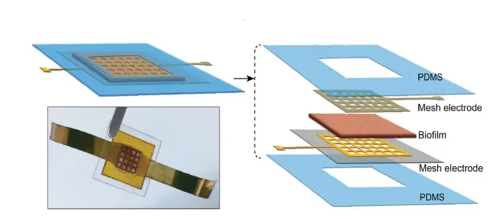 Dalam studi UMass, biofilm diapit di antara elektroda dan polimer lengket untuk membuat persegi berukuran prangko kecil yang dapat menempel pada kulit pengguna.
