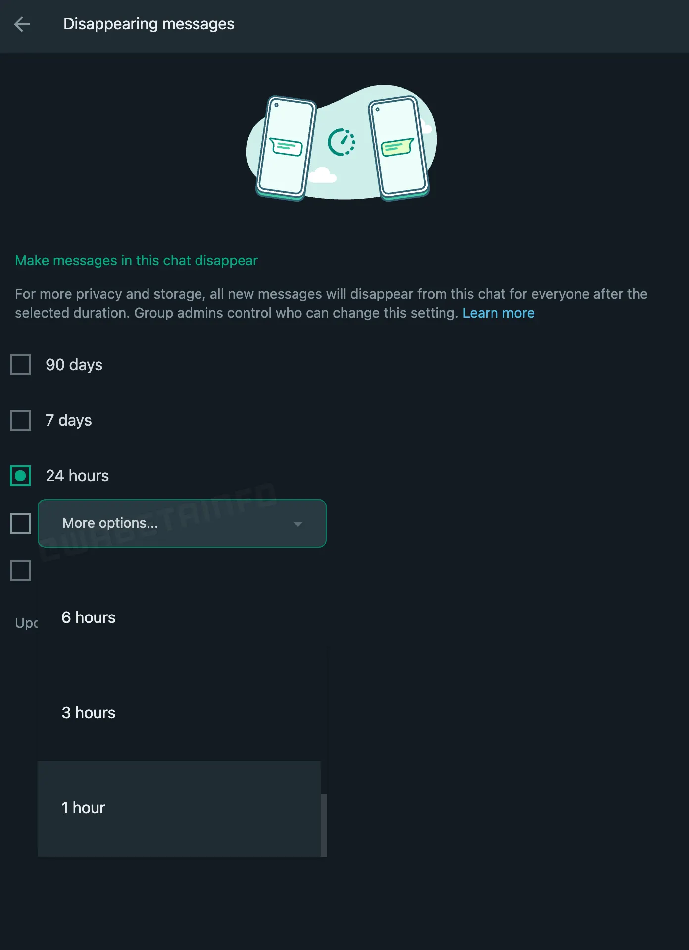 WABetaInfo juga mengatakan bahwa durasi tambahan disappearing messages ditemukan di aplikasi WhatsApp untuk desktop. Tetapi tak perlu khawatir, sebab fitur berguna ini akan hadir juga di WhatsApp untuk Android dan iOS.