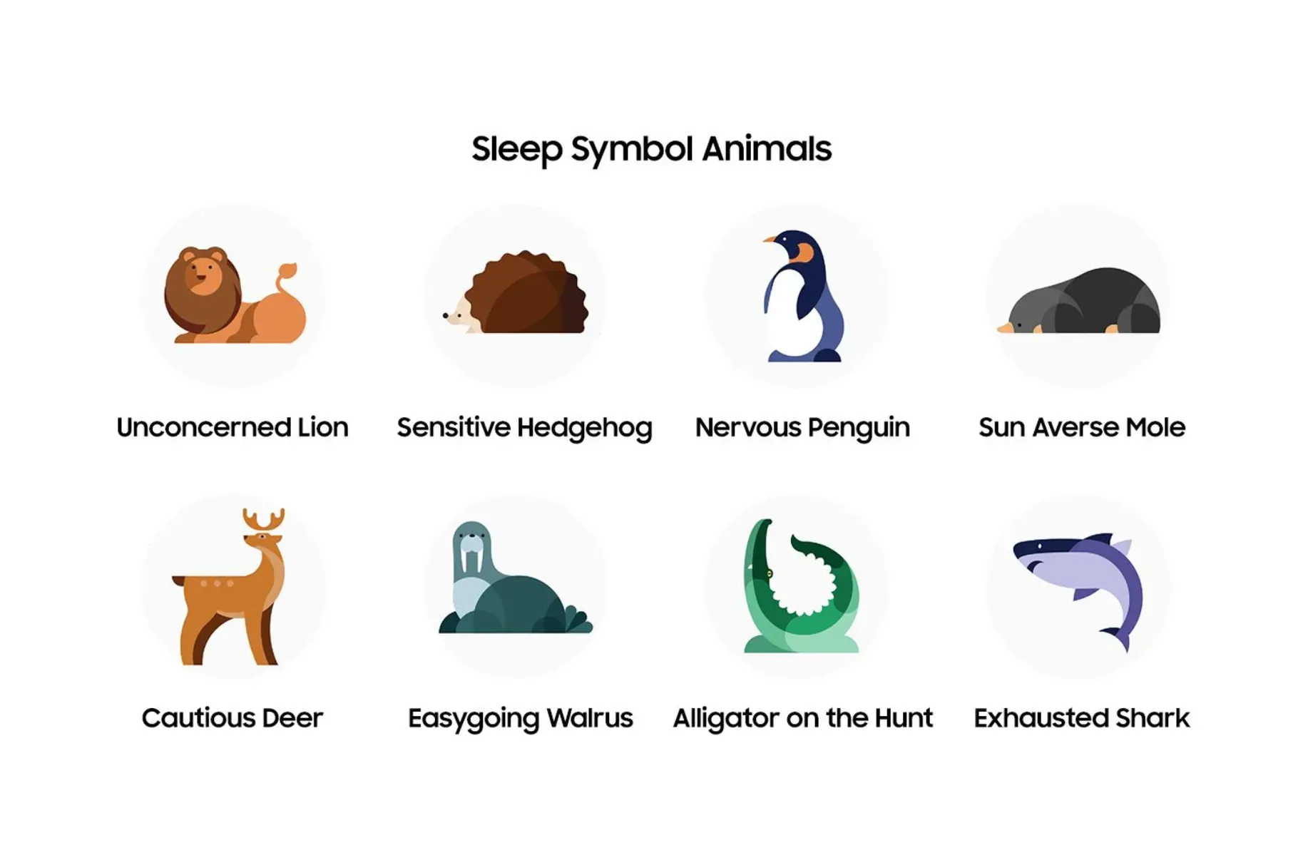 Secara tradisional, orang dikategorikan ke dalam empat kronotipe yang terkait dengan hewan yakni singa, lumba-lumba, beruang, dan serigala. Tetapi sepertinya Samsung melangkah lebih jauh dan memperluasnya menjadi delapan jenis.
