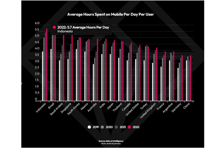 Menurut Data.ai, pada 2019 orang Indonesia rata-rata menghabiskan 3,9 jam setiap harinya untuk bermain ponsel. Kemudian, pada 2020, waktunya meningkat hingga 5 jam per hari. Lamanya rata-rata waktu yang dihabiskan orang Indonesia meningkat  jadi 5,4 jam per hari pada 2021, dan pada 2022 jadi 5,7 jam per hari.
