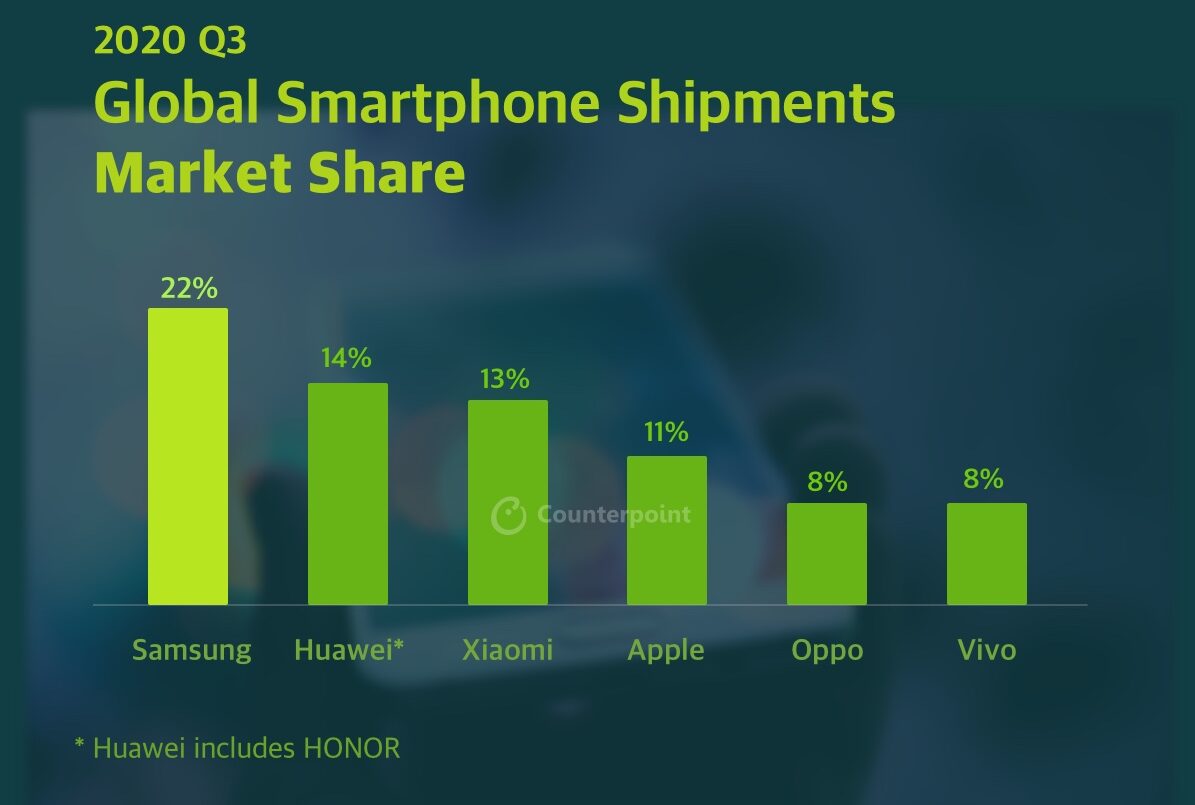 Berdasarkan laporan firma riset yang berpusat di Hong Kong itu, pengiriman pada kuartal ketiga 2020 dalam pasar smartphone global (Global Smartphone Market) mengalami penurunan sebesar 4% year-on-year (YoY), tetapi terdapat kenaikan 32% quarter-on-quarter (QoQ). Secara keseluruhan, seluruh pasar telah mengirimkan 366 juta unit.