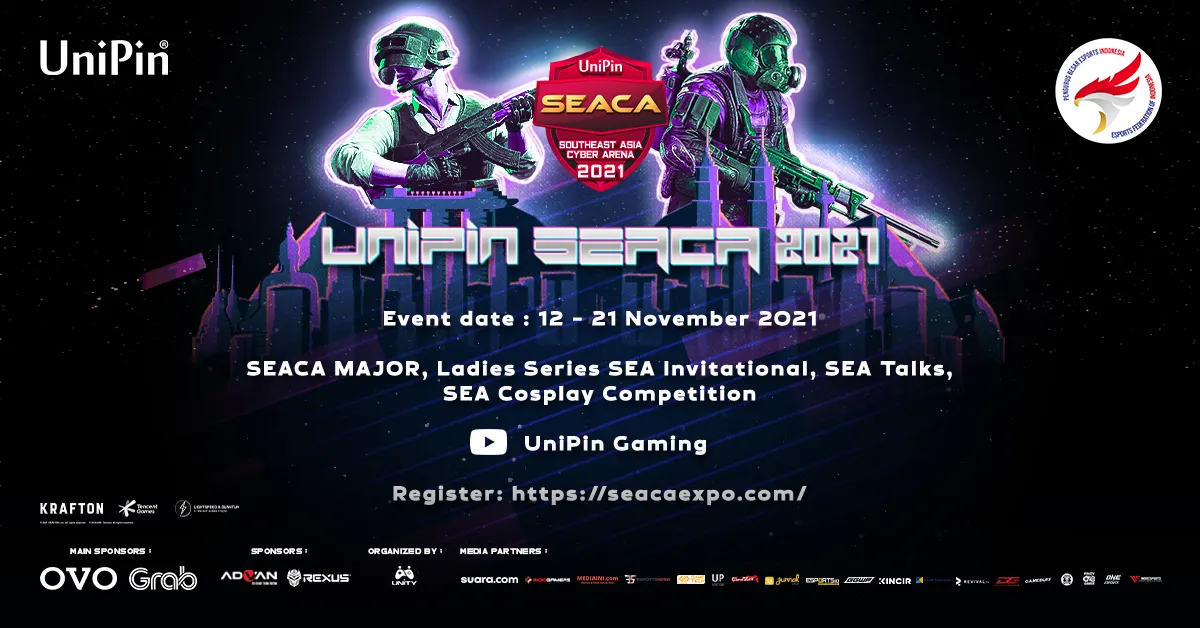 UniPin SEACA 2021 diselenggarakan oleh UniPin Community (UNITY) dan didukung oleh PBESI, Tencent, Moonton, OVO, Grab, Advan, Rexus dan Sandisk. Segala informasi terkini secara resmi terkait dapat diakses melalui situs www.seacaexpo.com. Disarankan untuk dapat registrasi lebih awal melalui situs untuk dapat akses ke turnamen, webinar dan entertainment lainnya mulai 10 November 2021. Ikuti juga akun Instagram @seaca.gg ataupun @unipinladiesseries untuk informasi terkait masing-masing turnamen.