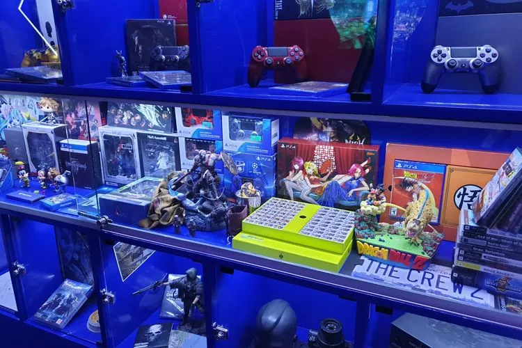 Selain itu, ada pula beberapa rak yang memajang beragam produk yang telah diluncurkan Sony, mulai dari PS1, PS2, PSP, hingga aneka konsol PS4 edisi spesial, seperti PS4 edisi Death Stranding.
