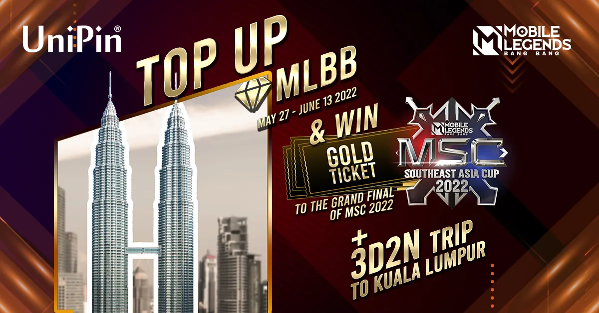 Menyambut MSC 2022, UniPin membuka kesempatan emas untuk mendapatkan Gold Ticket MSC 2022 sekaligus akomodasi dan tiket untuk trip 3 hari 2 malam ke Kuala Lumpur. Caranya mudah, cukup top-up Diamonds MLBB sebanyak-banyaknya di unipin.com, maka peluang untuk menonton Grand Final MSC 2022 akan semakin besar. Program ini akan berlangsung sejak tanggal 27 Mei hingga 13 Juni, di mana UniPin juga akan menawarkan beragam hadiah menarik lainnya seperti Limited Epic Skin MLBB dan berbagai in-game item MLBB. Para pemenang akan diumumkan pada tanggal 15 Juni 2022.