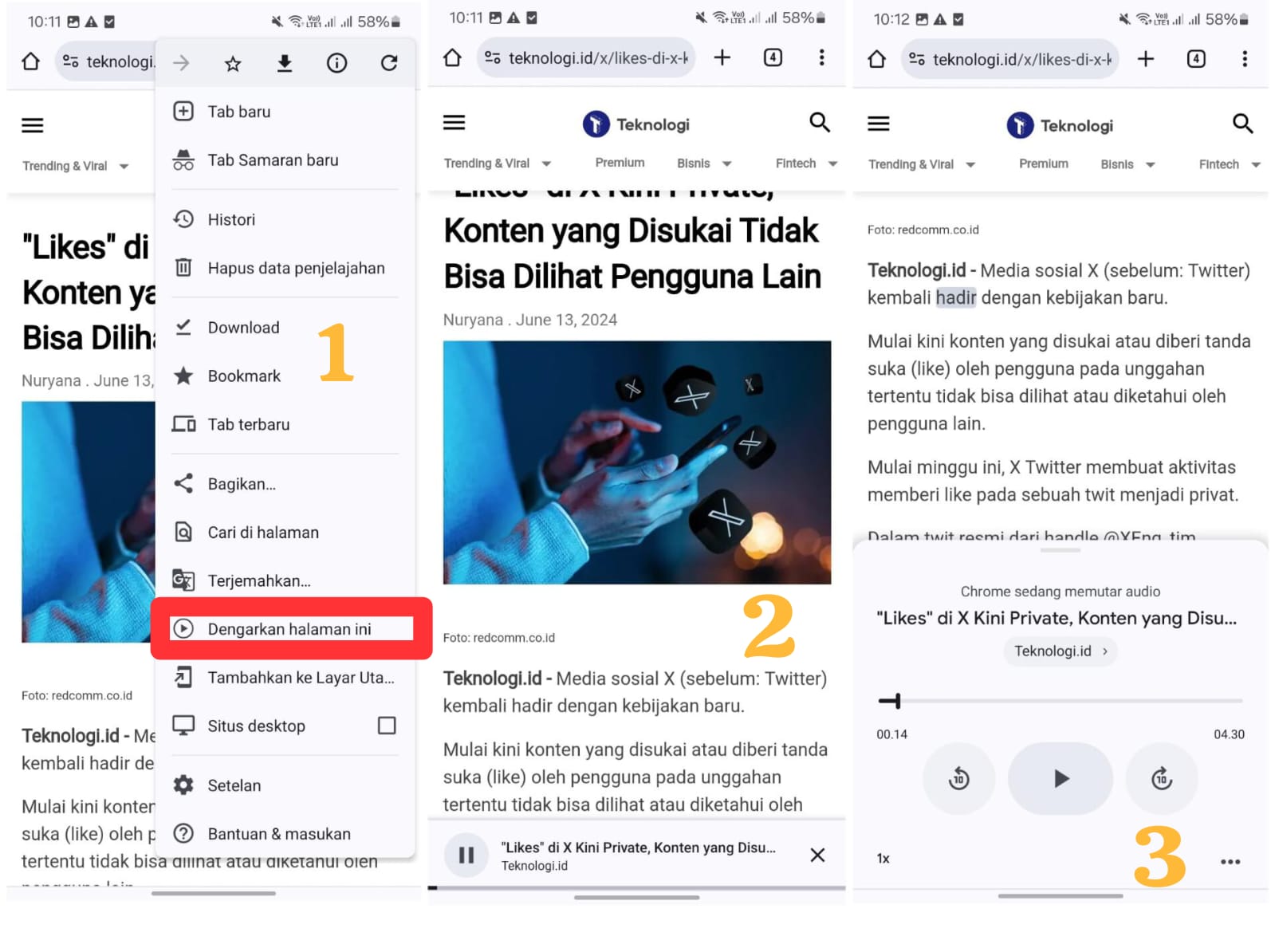 Setelah memilih opsi "Listen to this page", Chrome akan membacakan isi laman web atau artikel yang sedang dibuka atau ditelusuri.