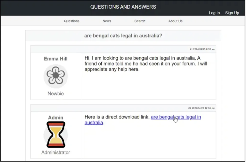 Segera setelah mengklik tautan forum tersebut, sebuah file .zip yang berisi malware pada postingan palsu yang dibuat oleh seseorang yang mengaku sebagai admin akan diunduh ke C:\Users<Username>\Downloads\Are_bengal_cats_legal_in_australia_33924.zip di perangkat korban.
