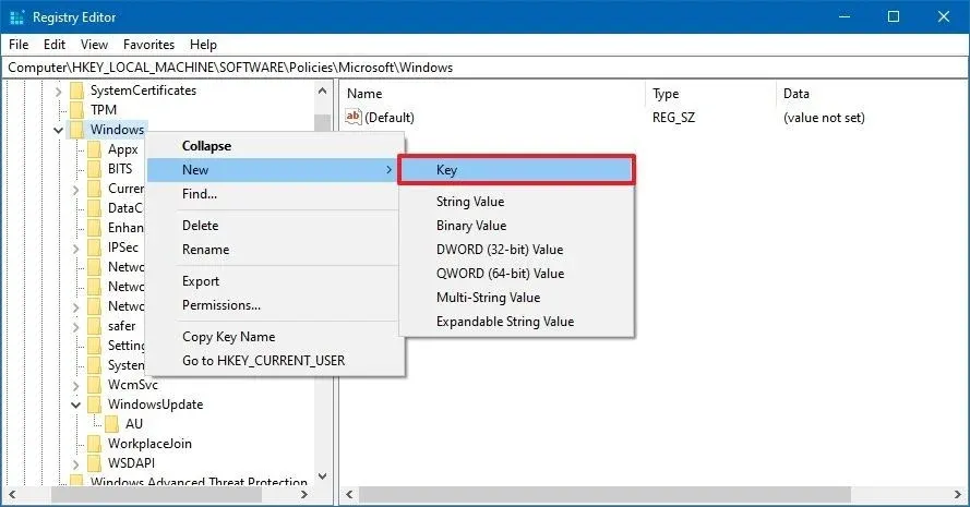 Kemudian, klik pada folder WindowsUpdate. Jika tidak ada, klik kanan pada folder Windows, pilih New dan klik opsi Key. Ganti namanya sebagai WindowsUpdate.