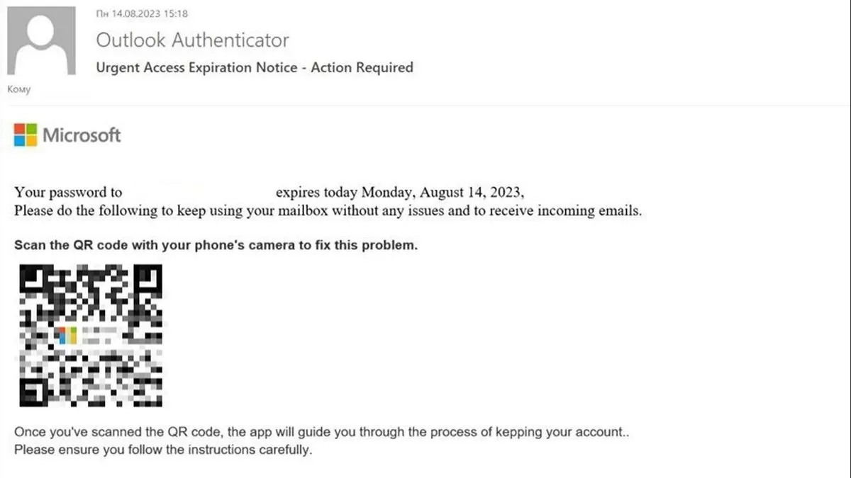 Email QR Code ini biasanya berisi pemberitahuan yang mengatakan bahwa kata sandi akun calon korban akan segera kadaluarsa dan pengguna akan kehilangan akses ke email tersebut, sehingga kata sandi harus diubah dan diperlukan pemindaian QR Code di email dan mengikuti instruksi yang telah diberikan. Pelaku juga mengancam, jika QR Code tidak dipindai maka pengguna akan kehilangan akses ke email tersebut selamanya.