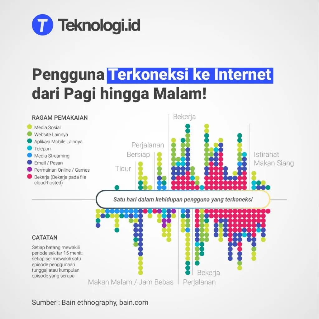 Pada gambar diatas, digambarkan rentang waktu aktivitas dalam satu hari dimana setiap waktunya pengguna tetap terhubung melalui berbagai macam kegiatan. Terlihat jelas bahwa setiap saat hal tidak mungkin terlewat adalah mengakses media sosial dan website. Adapun perbedaannya adalah pada lama waktu akses. Aktivitas lainnya yang tidak terlewat adalah membuka aplikasi mobile. Melalui gambar ini, kita dapat menarik kesimpulan bahwa di masa yang akan datang segala aktivitas akan dapat dilakukan melalui internet dan smartphone. Infografik ini pertama kali tayang di