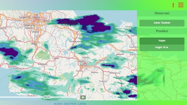 - Klik menu "Hujan" di samping peta untuk melihat prakiraan hujan. Jika legenda hujan semakin gelap, maka kemungkinan curah hujan juga semakin tinggi