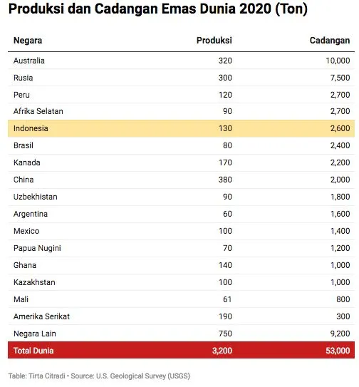 Sedangkan untuk negara Indonesia, melansir data yang sama ternyata RI ada di posisi ke-5. RI memiliki cadangan emas 2.600 ton, dengan produksi emas 130 ton.