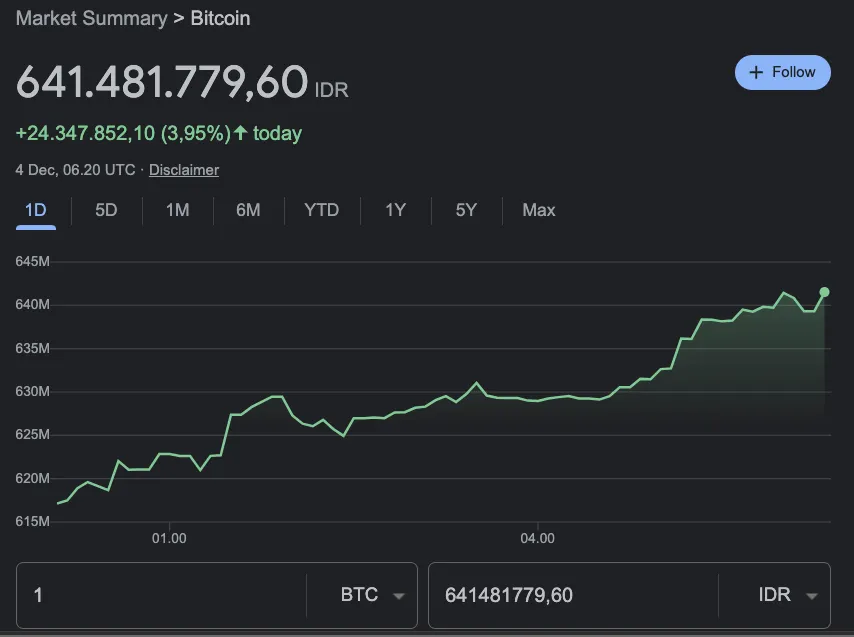 Pada Senin (4/12/2023), dalam 24 jam terakhir, Bitcoin diperdagangkan antara 39.306 dollar AS hingga level tertinggi 41.498 dollar AS (sekitar Rp 641 juta). Dalam sebulan terakhir, harga Bitcoin naik 14 persen, sementara kenaikan sejak awal tahun 2023 mencapai 140 persen.