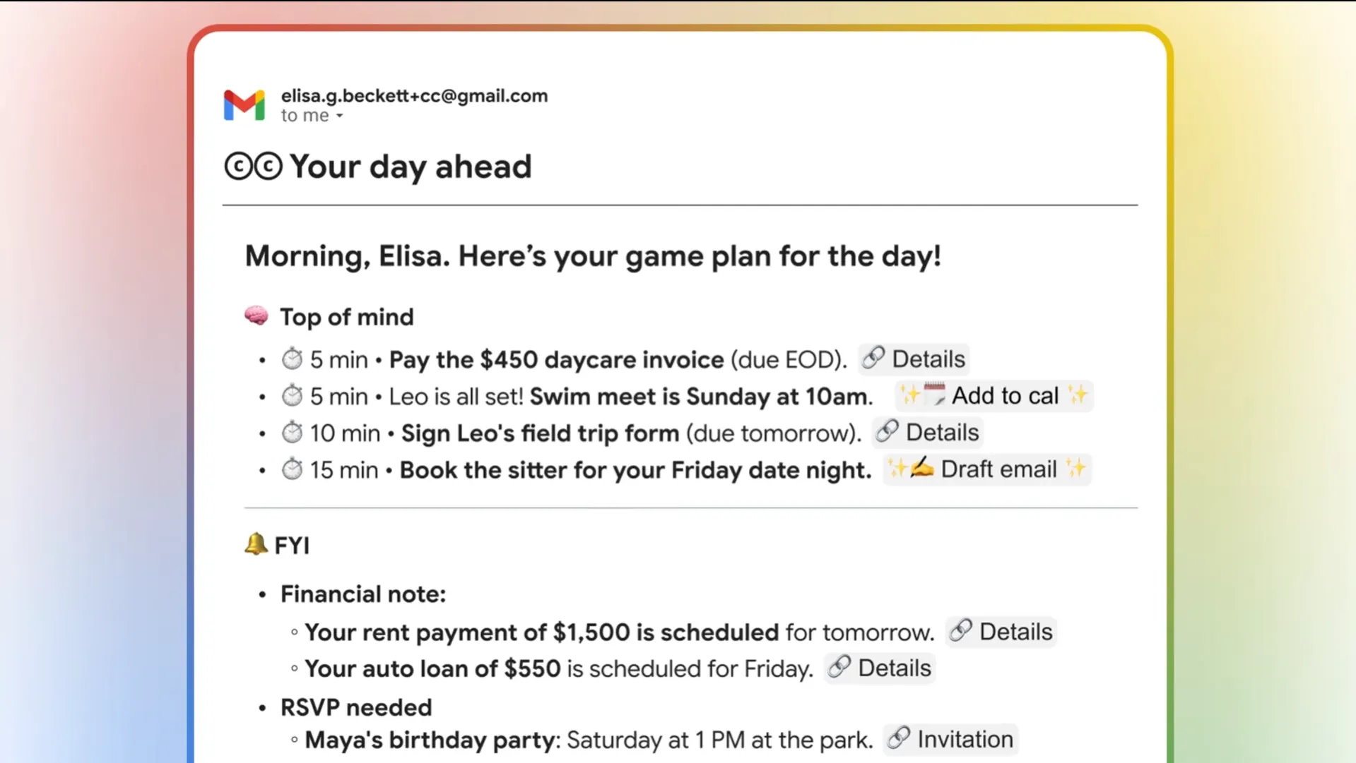 Uraian ini bukan hanya berisi daftar acara, tetapi juga menyoroti tugas penting, meeting yang akan datang, deadline bahkan notifikasi dengan urgensi tinggi seperti tagihan yang belum dibayar dan persiapan janji temu (appointment). Dengan menggali sinyal dari layanan Google pengguna dan menytukannya dengan konteks web relevan, CC memastikan pengguna memulai hari mereka dengan gambaran umum yang lengkap dan rapih tentang apa yang perlu diselesaikan.