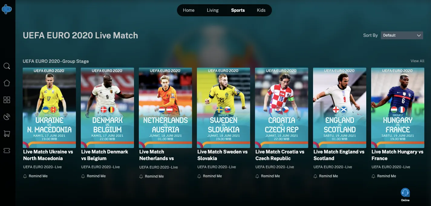 Untuk menonton EURO, kamu bisa masuk ke menu sports. Di halaman tersebut, tinggal pilih mana pertandingan yang ingin kamu saksikan. Kamu juga bisa mengakses streaming berdasarkan negara ataupun bisa juga klik live match.