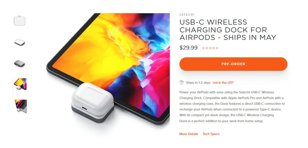 Perangkat yang diberi nama USB-C Wireless Charging Dock for Apple AirPods ini berbentuk persegi dan didesain menggunakan aluminium. Charger ini berukuran cukup kecil, dengan dimensi 2.28 x 1.75 x 0.48 inci seberat 3 gram.