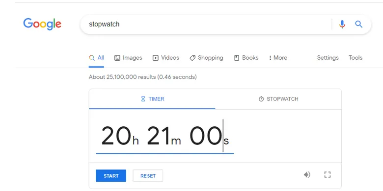 Kamu bisa menggunakan stopwatch dan timer langsung dari mesin pencarian Google. Caranya cukup mudah. Masukan kata kunci "stopwatch" atau "timer" di kolom pencarian Google. Klik "stopwatch" jika butuh menghitung lama durasi atau pilih "timer" untuk memberi batas waktu untuk sesuatu.