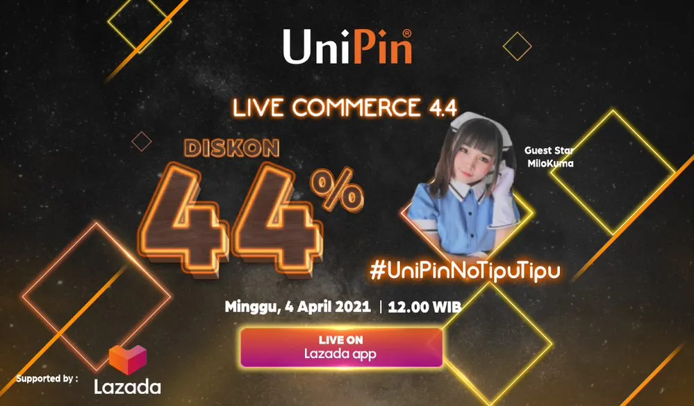 Memanfaatkan moment ini, Lazada menggandeng UniPin, penyedia layanan top-up game online dan konten digital terdepan di Indonesia mengadakan live commerce 4.4. Acara streaming ini akan diselenggarakan pada hari Minggu, 4 April mendatang di situs atau aplikasi Lazada, LazLive.com. Dengan penawaran terbatas, acara ini akan berlangsung selama satu jam saja mulai dari 12.00 hingga 13.00 WIB.