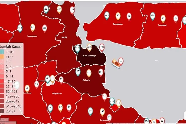 Peta persebaran pasien Covid-19 di Indonesia. Surabaya lebih gelap dibandingkan daerah lainnya.