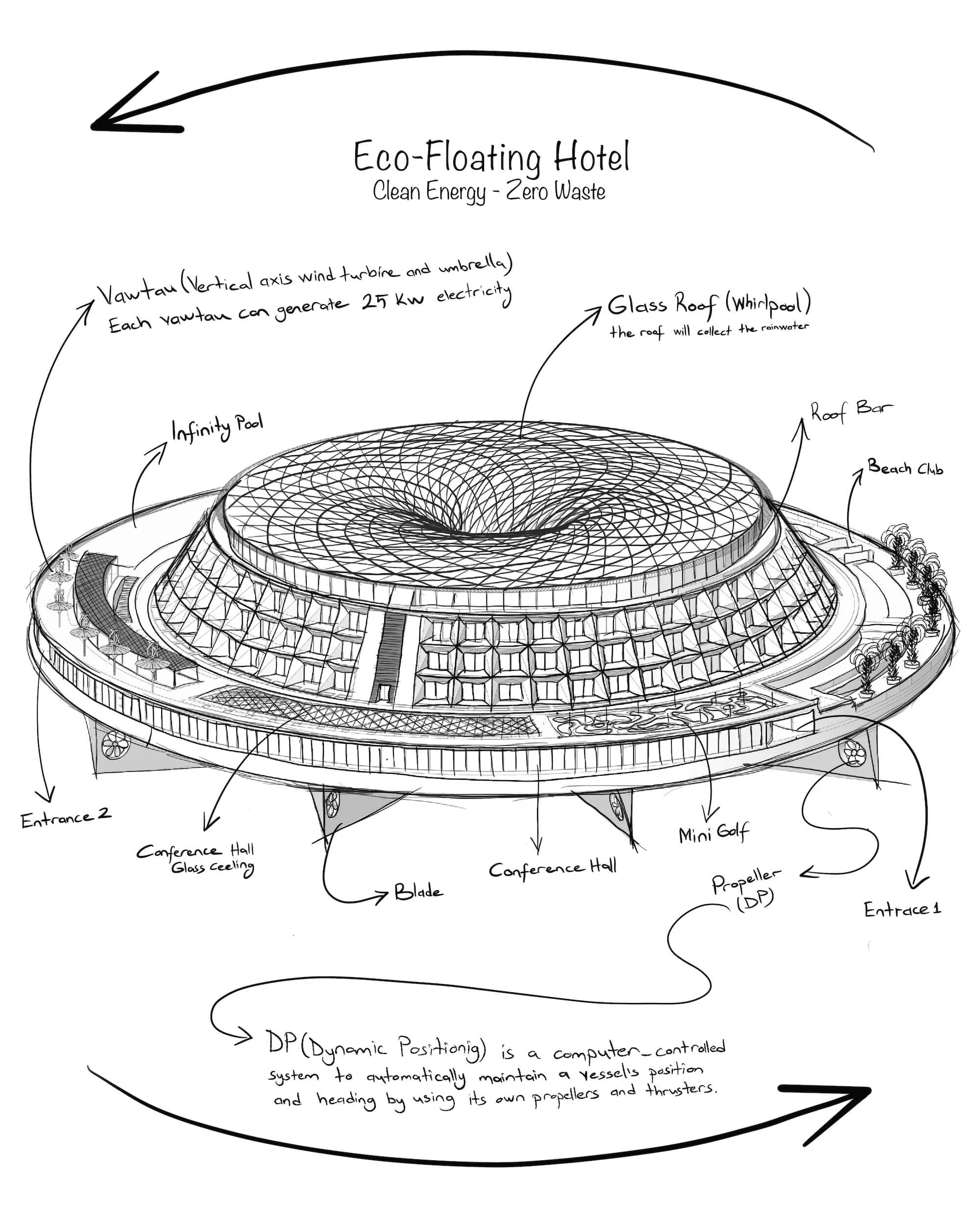 Alih-alih menggunakan sumber energi fosil, hotel ini mengadopsi metode yang memanfaatkan energi bersih sebagai sumber energi utama dengan berbagai macam inovasi teknologi seperti akumulasi air hujan, Vawtau Modules, dan pergerakan rotasi bangunan yang mengambang di atas laut.