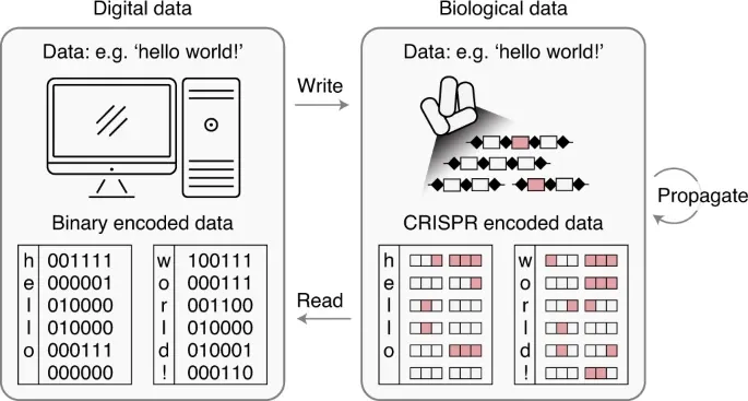 Kode komputer terdiri dari angka nol dan satu dan setiap digit disebut sebut "bit" informasi. Untaian rantai DNA terdiri dari empat bahan kimia dasar yaitu A (Adenine), C (Sitosin), G (Guanin), dan T (Timin) yang dapat diubah menggunakan alat bioteknologi seperti CRISPR.