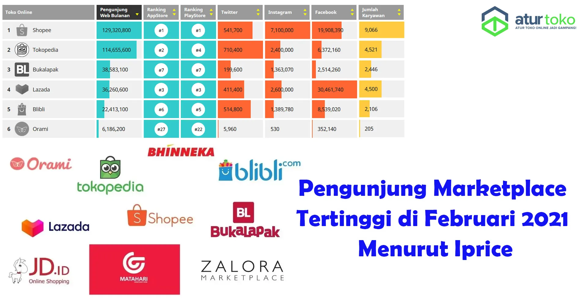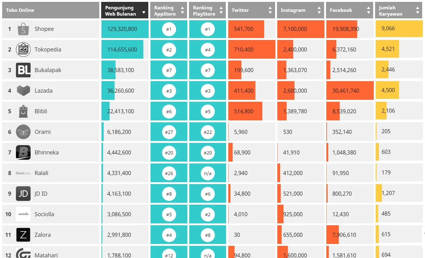 Menurut Iprice Marketplace dengan pengunjung tertinggi masih diduduki Marketplace Shopee dengan jumlah pengujung sekitar 129 jt, lalu berikutnya Marketplace Tokopedia dengan jumlah pengujung sekitar 114 jt, lalu berikutnya Marketplace Bukalapak dengan jumlah pengujung sekitar 38 jt, lalu berikutnya Marketplace Lazada dengan jumlah pengujung sekitar 36 jt, lalu berikutnya Marketplace Blibli dengan jumlah pengujung sekitar 22 jt, lalu berikutnya Marketplace Orami dengan jumlah pengujung sekitar 6 jt, lalu berikutnya Marketplace Bhineka dengan jumlah pengujung sekitar 4 jt, lalu berikutnya Marketplace Ralali dengan jumlah pengujung sekitar 4 jt, lalu berikutnya Marketplace JDID dengan jumlah pengujung sekitar 4 jt. Kamu bisa melihat detail datanya di disini https://iprice.co.id/insights/mapofecommerce/