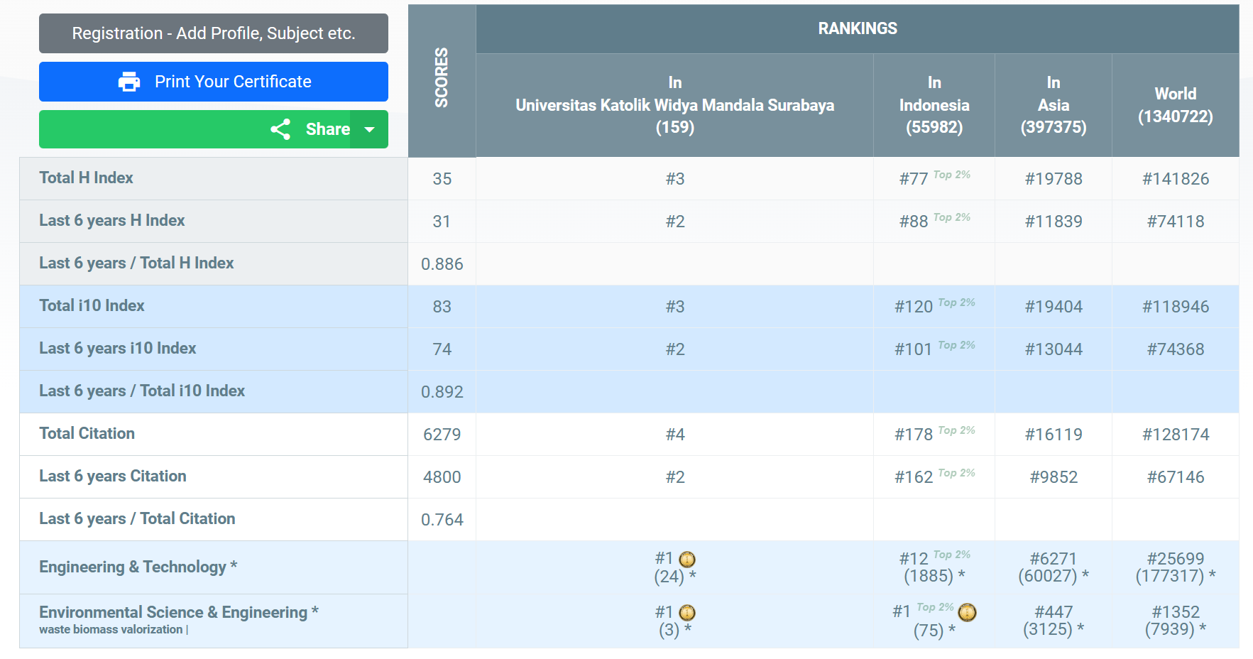 Dengan hasil skor yang tertera di bawah, Felycia Edi Soetaredjo menempati peringkat #3 Universitas (Universitas Katolik Widya Mandala Surabaya), #77 Indonesia, #19788 Asia, #141826 Dunia secara keseluruhan subjek yang termasuk ke dalam kategori AD Scientific Index.