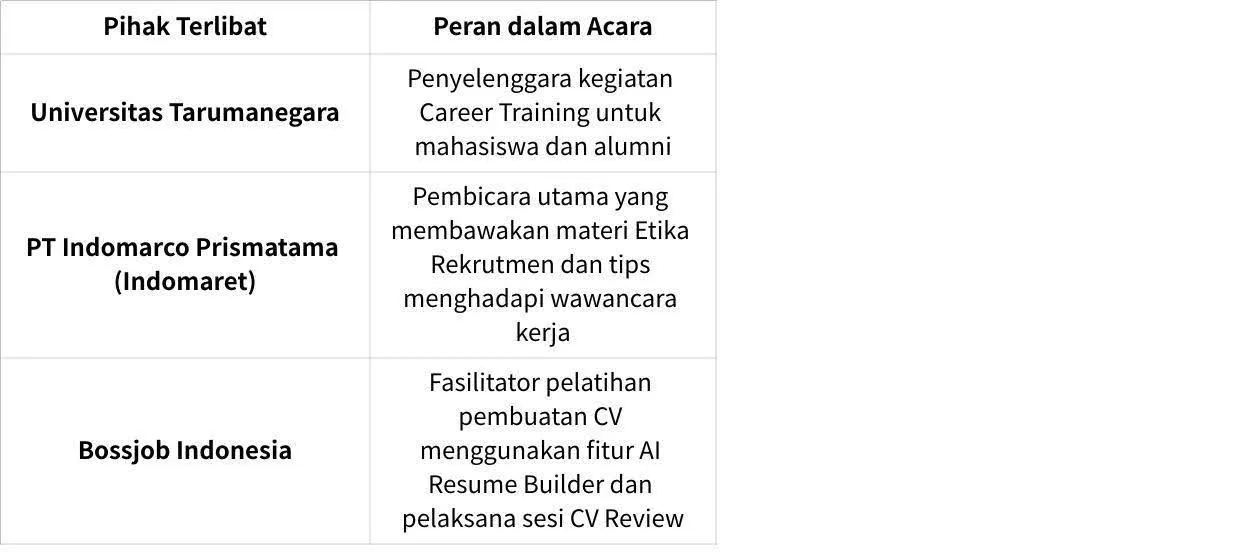 Kerja sama antara Bossjob Indonesia dan Universitas Tarumanegara menjadi salah satu langkah strategis dalam mendukung pengembangan sumber daya manusia unggul di Indonesia. Dalam kegiatan yang diselenggarakan di kampus UNTAR tersebut, acara menghadirkan HR Recruiter dari PT Indomarco Prismatama (Indomaret) sebagai pembicara tamu serta perwakilan dari Bossjob Indonesia sebagai fasilitator sesi pelatihan digital.