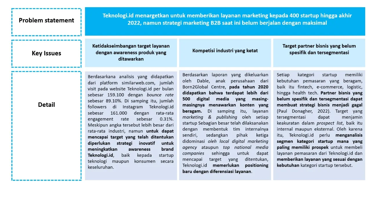 Pada tahun 2020 ini, Teknologi.id telah memiliki audiens yang besar yakni lebih dari 1 juta unique visitors dengan pertumbuhan 260%+ YoY. Dengan besarnya jumlah audiens tersebut, Teknologi.id menawarkan lima jenis marketing services dengan target serving 400 medium-sized startup dalam tahun 2022. Untuk dapat mencapai target tersebut, perusahaan ini perlu mengetahui landscape startup di Indonesia, memahami marketing activities pada industri dengan jumlah startup terbanyak, dan menentukan strategi yang paling efektif untuk dapat menjangkau pasar tersebut.