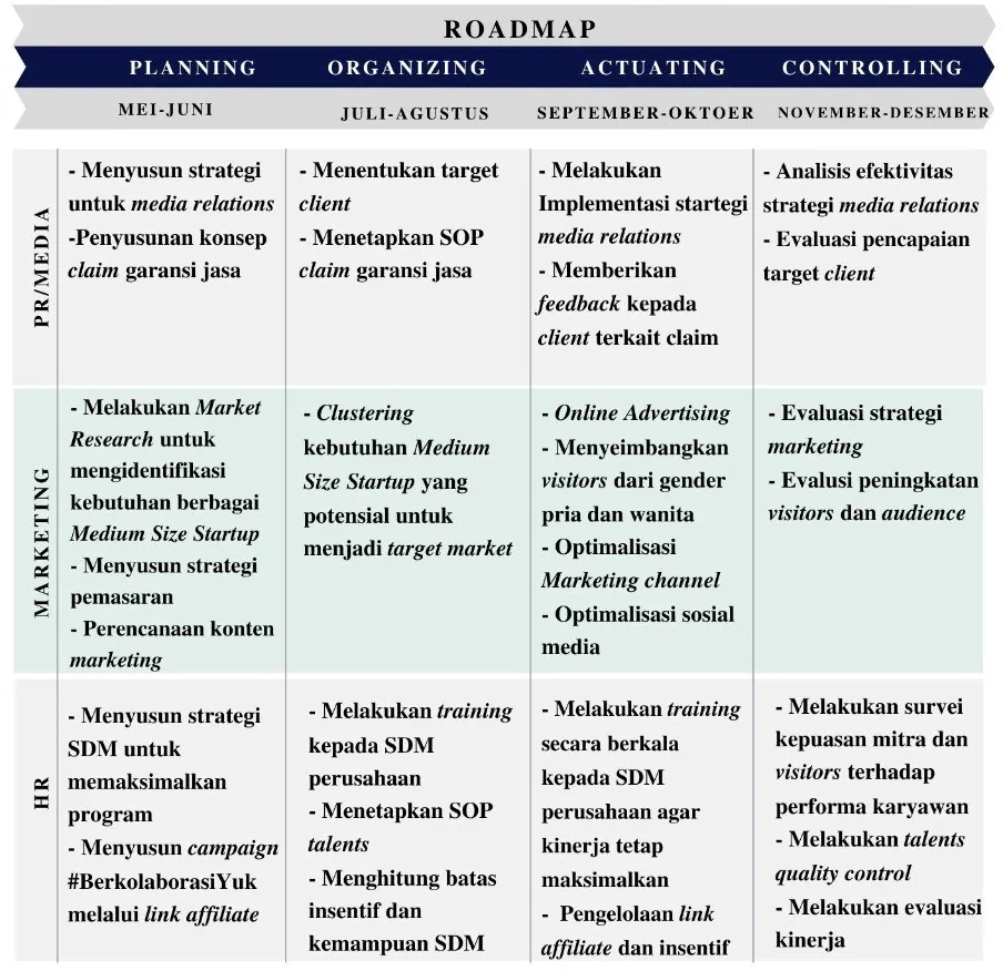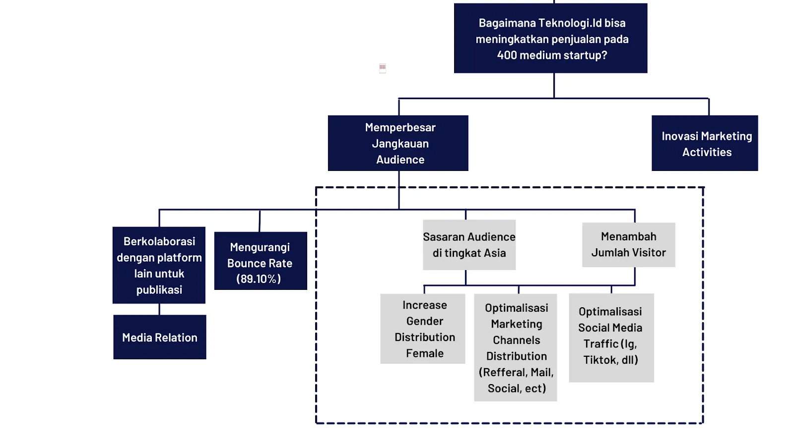 3. Pemaparan Masalah: Issue Tree Sumber : Analisis Penulis Issue tree dibuat untuk membedah masalah menjadi isu-isu dasar yang dapat menjawab permasalahan utama. Berdasarkan issue tree ini, dapat dilihat terdapat 3 sub issue yang dapat diselesaikan untuk menjawab permasalahan utama. Sub issue yang menjadi fokus penyelesaian adalah mengurangi ketimpangan gender distribution dari audience, mengoptimalkan marketing channnel distribution serta mengoptimalkan social media traffic. 5. Strategi Solusi (GROW'S STRATEGY) Expand Audience : Campaign untuk meningkatkan brand awareness pada wanita Strategi Expand Audience dapat dilakukan melalui Recruitment Talent dibarengkan dengan campaign #BerkolaborasiYuk melalui social media dengan pemberian insentif kepada talent melalui link affiliate-nya, semakin banyak link tersebut di klik maka semakin tinggi pula komisinya. Selain itu, talent dapat mengajak teman menggunakan kode referal miliknya dan memperoleh komisi. Metode Quality control social media yang digunakan talent dalam membagikan videonya, terlebih dahulu akan dilakukan seleksi oleh Teknologi.id. Adanya talent-talent konten tiktok dan instagram, didukung dengan script relevan seperti konten make up dan fashion wanita, secara tidak langsung audience wanita akan tertarik pada konten Teknologi.id. Dengan demikian Teknologi.id dapat memenuhi target pasar audience wanita dan mengurangi ketimpangan gender distribution dari audience. Growth Sales Marketing Produk Teknologi.id dapat dilakukan dengan pengiklanan produk melalui sosial media baik Social Media Marketing, Digital Advertising dan strategi pengoptimalan Media Publication. Strategi peningkatan penjualan lainnya adalah pemberian garansi kepada client atas jasa yang di order jika tidak sesuai. Kombinasi antara garansi produk dengan Media Relation yang semakin banyak ditambah dengan performa perusahan yang baik maka para pebisnis startup tidak akan ragu lagi dalam menggunakan jasa Teknologi.id untuk online pressense bisnisnya. 6. Roadmap Dalam menggambarkan penerapan solusi yang ada, Teknologi.id dapat menggunakan Roadmap sebagai acuan dalam menjalankan rangkaian strategi. Roadmap ini disusun dengan menggunakan framework POAC (Planning, Organizing, Actuating, Controlling) agar solusi memiliki dampak yang signifikan bagi Teknologi.id. Selain itu, terdapat 3 divisi utama yang akan berperan pula dalam proses implementasi solusi yaitu Public Relation atau Media, Marketing, dan Human Resource. Visualisasi Roadmap Teknologi.id dapat dilihat pada gambar berikut: Sumber : Analisis Penulis 7. Referensi Abdulaziz Albaz, M. D. T. R. d. J. S., 2020. Membuka kunci pertumbuhan di usaha kecil dan menengah. McKinsey. Andri Helmi M, S. M., 2021. Strategic Marketing Planning Perencanaan dan Pengembangan Bisnis. Marketing. Boone L. E. dan Kurtz D. L. (2005). Marketing Contemporary. Erlangga : Jakarta. Eric Ries. 2011. The Lean Startup: How Today's Entrepreneurs Use Continuous Innovation to Create Radically Successful Businesses. Crown Business. Miletsky, J. I., Smith, G. (2009). Perspectives on Branding. Course Technology Planning, S. M., 2020. Strategic Marketing Planning. Jurnal Ekonomika dan Bisnis. Puspita, U. W. d. A. E., 2017. Upaya Peningkatkan Brand Awareness PT. Go-Jek Indonesia Melalui Aktivitas Marketing Public Relations. Jurnal Komunikasi , 9(1), pp. 31 - 43 .