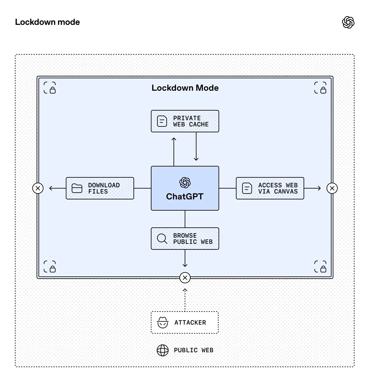 Salah satu contoh teknis dari cara kerja mode ini adalah pada fitur penjelajahan web (web browsing). Dalam kondisi Lockdown Mode, akses internet ChatGPT dibatasi hanya pada konten yang sudah tersimpan di memori (cached content). Hal ini memastikan tidak ada permintaan jaringan langsung yang keluar dari jaringan terkontrol milik OpenAI, sehingga penyerang tidak dapat "memancing" data sensitif pengguna ke server luar. Beberapa fitur lain yang tidak dapat dijamin keamanan datanya secara teknis bahkan akan dinonaktifkan sepenuhnya saat mode ini aktif.