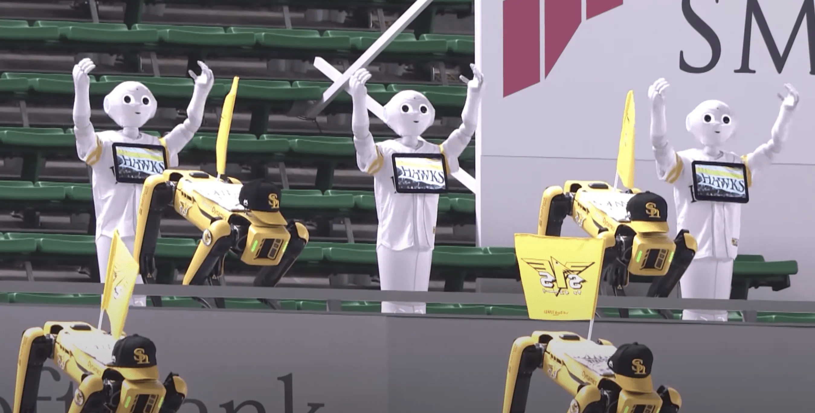 Dari video diatas, terpantau bahwa tim SoftBank Hawks menurunkan skuad cheerleader yang terdiri dari 20 robot humanoid Pepper yang mengenakan seragam tim. Selain itu, ada juga 20 robot Spot buatan Boston Dynamics yang mengenakan topi tim tuan rumah.