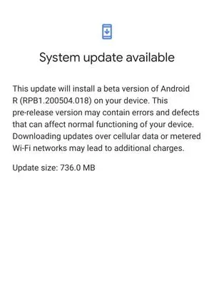 Mishal sendiri sempat membagikan tangkapan layar mengenai update Android 11 Beta 1 ke akun Twitter pribadinya. Dalam tangkapan layar tersebut, tertulis keterangan "Pembaruan ini bakal memasang versi beta dari Android R (RPB1.200504.018) di perangkat Anda,". Gambar tersebut juga bertuliskan mengenai ukuran file update yang mencapai 736 MB.