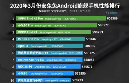 Berdasarkan daftar 10 besar smartphone tercepat bulan Maret 2020 dari AnTuTu, terlihat bahwa semuanya sudah menggunakan chipset buatan Qualcomm, yakni Snapdragon 865.