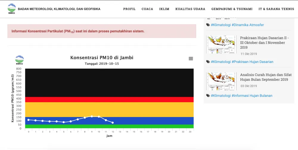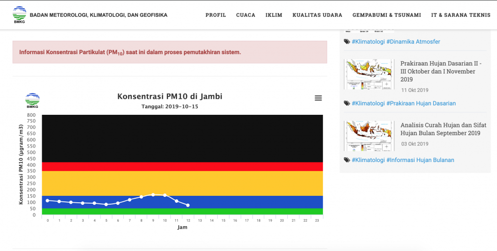 "Saat ini sedang ditangani dengan proses instalasi ulang. Informasi KU tetap dapat dilayankan kepada masyarakat melalui website dan apps infobmkg dengan mengandalkan pengiriman data hasil input manual di UPT BMKG daerah (tempat alat terpasang)," ujar Siswanto. Laman ini memberikan informasi Partikulat (PM10) menggunakan alat BMKG yang ada di daerah. PM10 adalah Partikel udara yang berukuran lebih kecil dari 10 mikron (mikrometer). Dalam laman tersebut tertulis jika konsentrasi PM10 berada pada rentang 0-150 mikrogram per meter kubik tergolong kualitas baik. Konsentrat antara 51-150 mikrogram tergolong sedang, 151-350 mikrogram tidak sehat, sementara 351-420 mikrogram per meter kubik termasuk berbahaya.