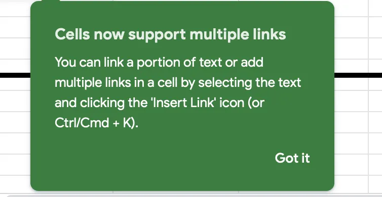 Jika sebelumnya untuk membuat hyperlink dari satu kalimat pengguna harus membuat cell tersendiri, kini dengan Google Sheets, penggunanya bisa membuat hyperlink untuk banyak link hanya dengan 1 cell. Meskipun terlihat sepele, fitur ini mampu mengurangi kebutuhan cell pengguna dalam satu dokumen.