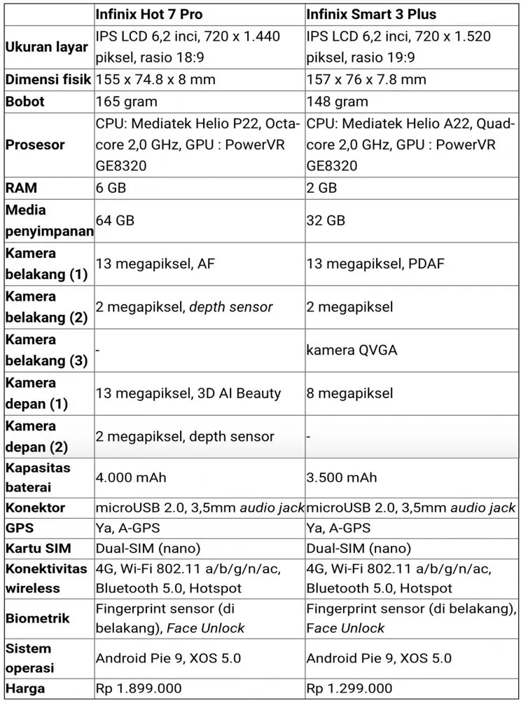 Spesifikasi Infinix Hot 7 Pro dan Smart 3 Plus