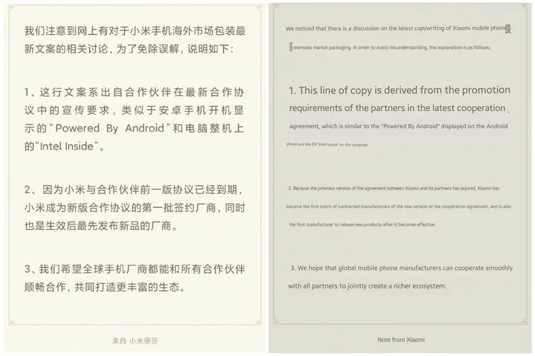 Konfirmasi soal itu didapat dari postingan akun resmi Xiaomi di Weibo –platform media sosial Cina. Salah satu poin pernyataan itu menyebut, “Tulisan itu merupakan bentuk persyaratan promosi partner kami yang merupakan bagian dari perjanjian kerjasama yang paling mutakhir. Serupa dengan keterangan “Power by Android” pada smartphone android dan “Intel Inside” pada computer.
