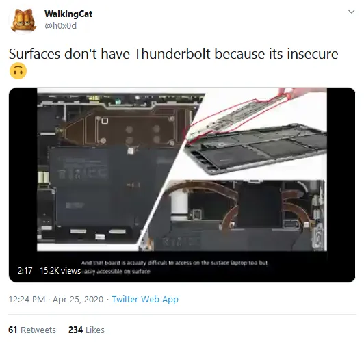 "Seluruh perangkat Microsoft tidak memiliki Thunderbolt," ungkap pegawai Microsoft tersebut. "Mengapa? Sebab, itu berarti akses penuh pada port memori," lanjutnya.
