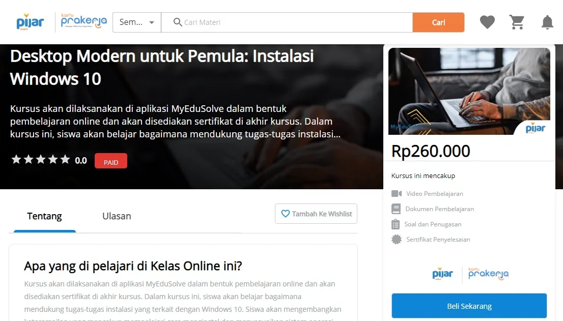 Dalam deskripsi pelatihan bertajuk 'Desktop Modern untuk Pemula: Instalasi Windows 10' tersebut mencakup video pembelajaran, dokumen pembelajaran, soal dan penugasan, dan sertifikat penyelesaian yang akan dilaksanakan di aplikasi MyEduSolve dalam bentuk pembelajaran online.