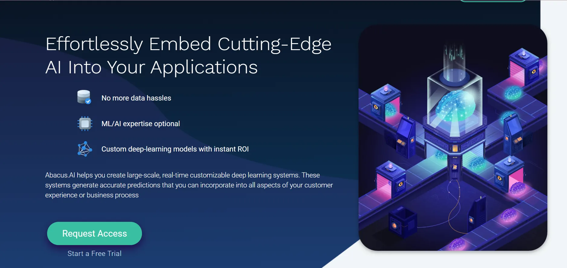 Abacus.ai membantu bisnis dengan memasukkan model AI ke dalam strategi skala produksi. Sejumlah survei menujukan banyak bisnis yang berusaha mengimplementasikan AI.
