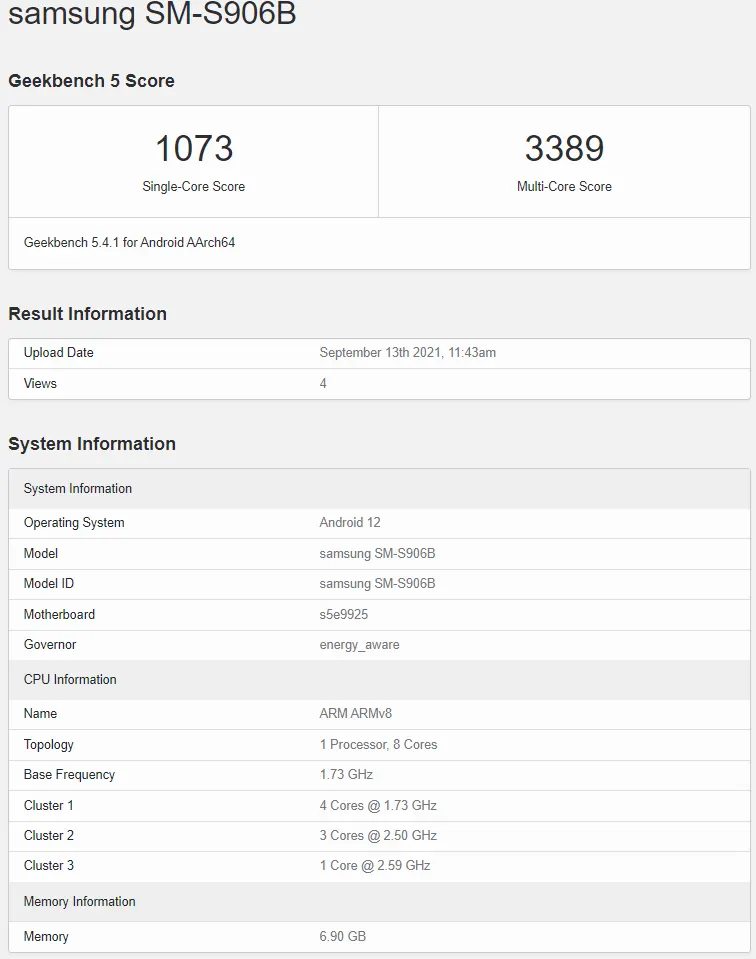Core paling kencang adalah ARM Cortex-X2 dengan kecepatan 2,59GHz,