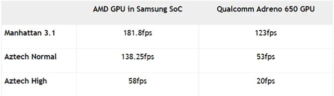 Dalam sebuah pengujian yang dilakukan benchmark Geekbench, skor yang dicapai oleh Exynos 1000 dengan teknologi GPU RDNA dari AMD mampu melampaui kecepatan GPU Adreno 650 dari Snapdragon 865.